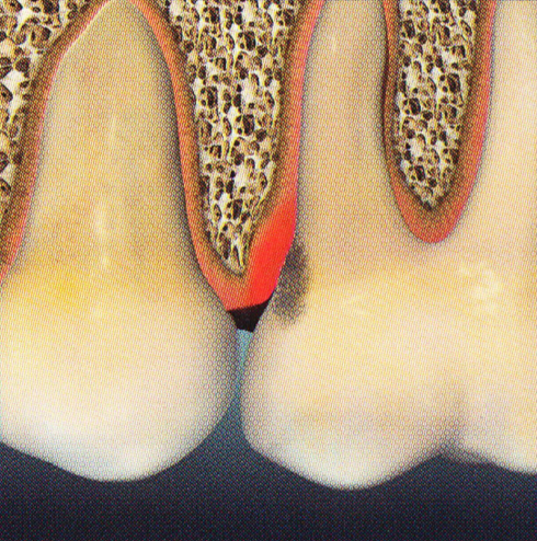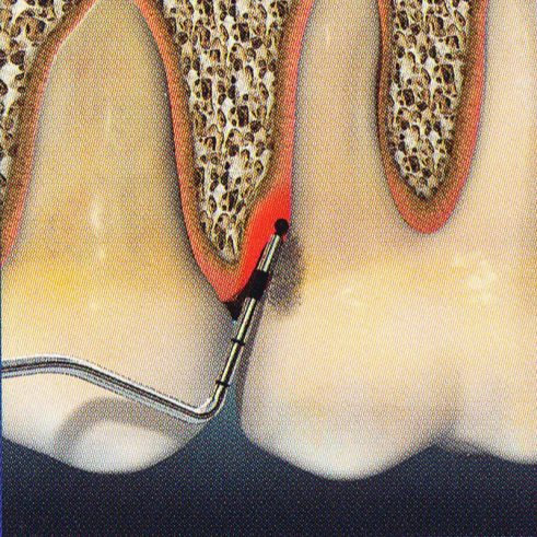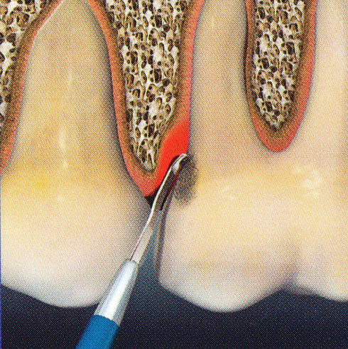 Das Herzstück der Basistherapie ist die "Wurzelglättung". Ihr Zahnarzt reinigt die Zahnfleischtasche bzw. die Wurzeloberfläche mit einem Handinstrument,